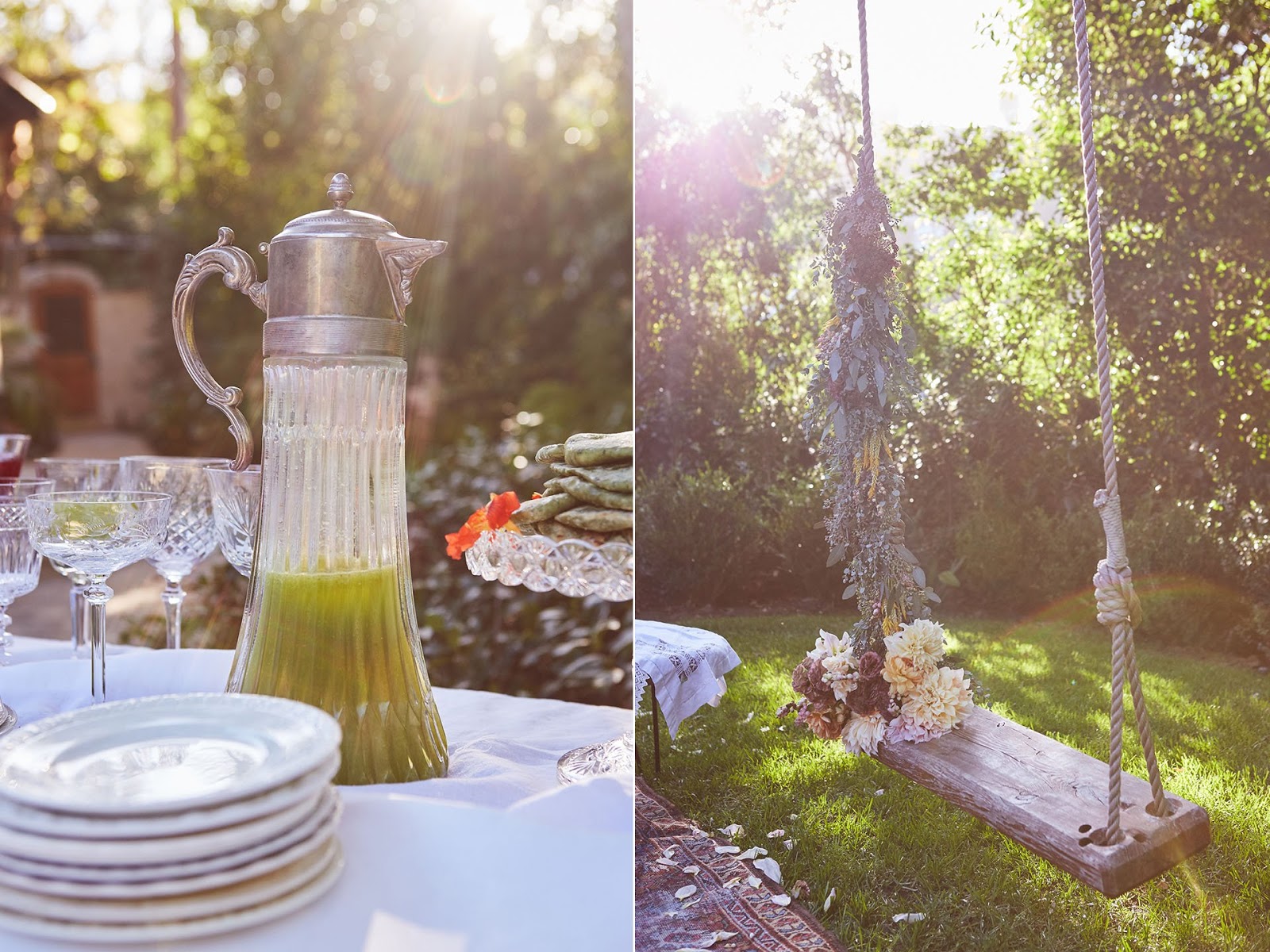 "We all gathered for an afternoon picnic in KK's backyard under her old oak tree, mood set by magic maker Amy Blessing and the most delicious and visually stunning food and cocktails by Lori Stern. Beneath this canopy of oak, with the ethereal southern California light filtering down through the leaves above, we talked and laughed for hours. It was a day of beauty and bounty, but above all it was an ushering in of spring and a celebration of life!"